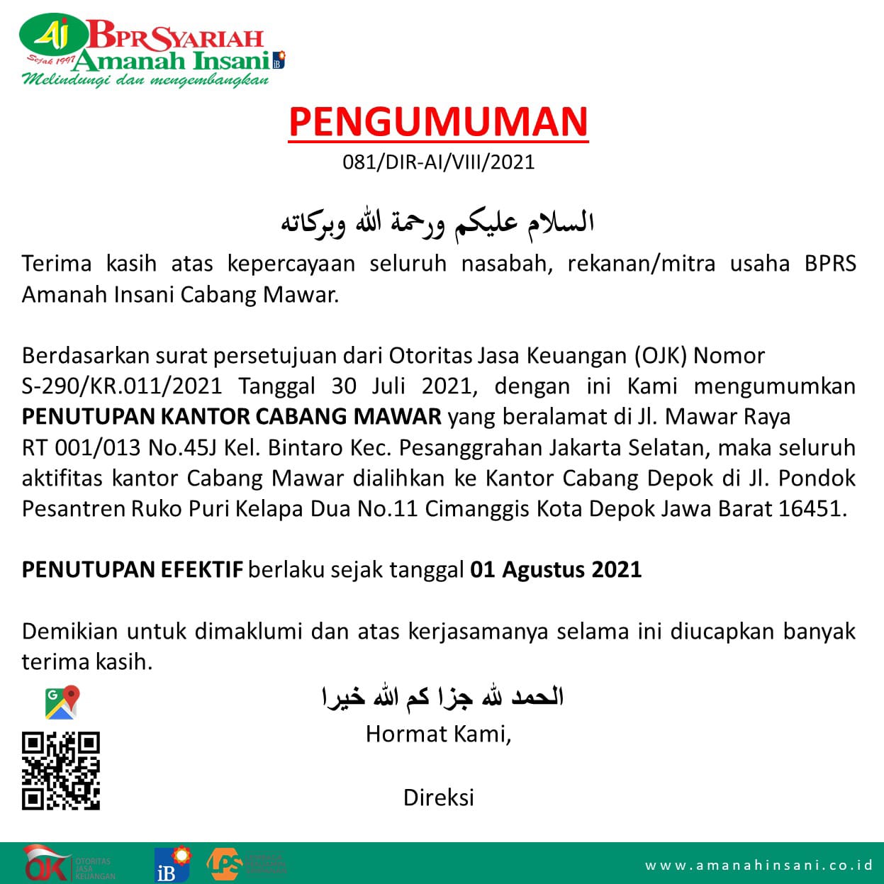 Kepada seluruh Nasabah, Deposan dan Penabung yg beraktifitas di kantor Cabang mawar ( Bintaro ) maka diberitahukan bahwa efektif tanggal 1 Agustus 2021 telah disetujui oleh OJK (Otoritas Jasa Keuangan) untuk penutupan kantor cabang mawar di Bintaro ( terlampir ). Dengan penutupan Kantor Cabang Mawar ini maka seluruh kegiatan dialihkan ke Kantor Cabang Depok. Demikian untuk dimaklumi dan diucapkan Terimakasih atas perhatian dan kerja sama nya selama ini. Semoga Alloh tetap memberikan pertolongan kepada kita semua tambah berkembang kemudahan Aman Selamat Lancar Barokah. Aamiin